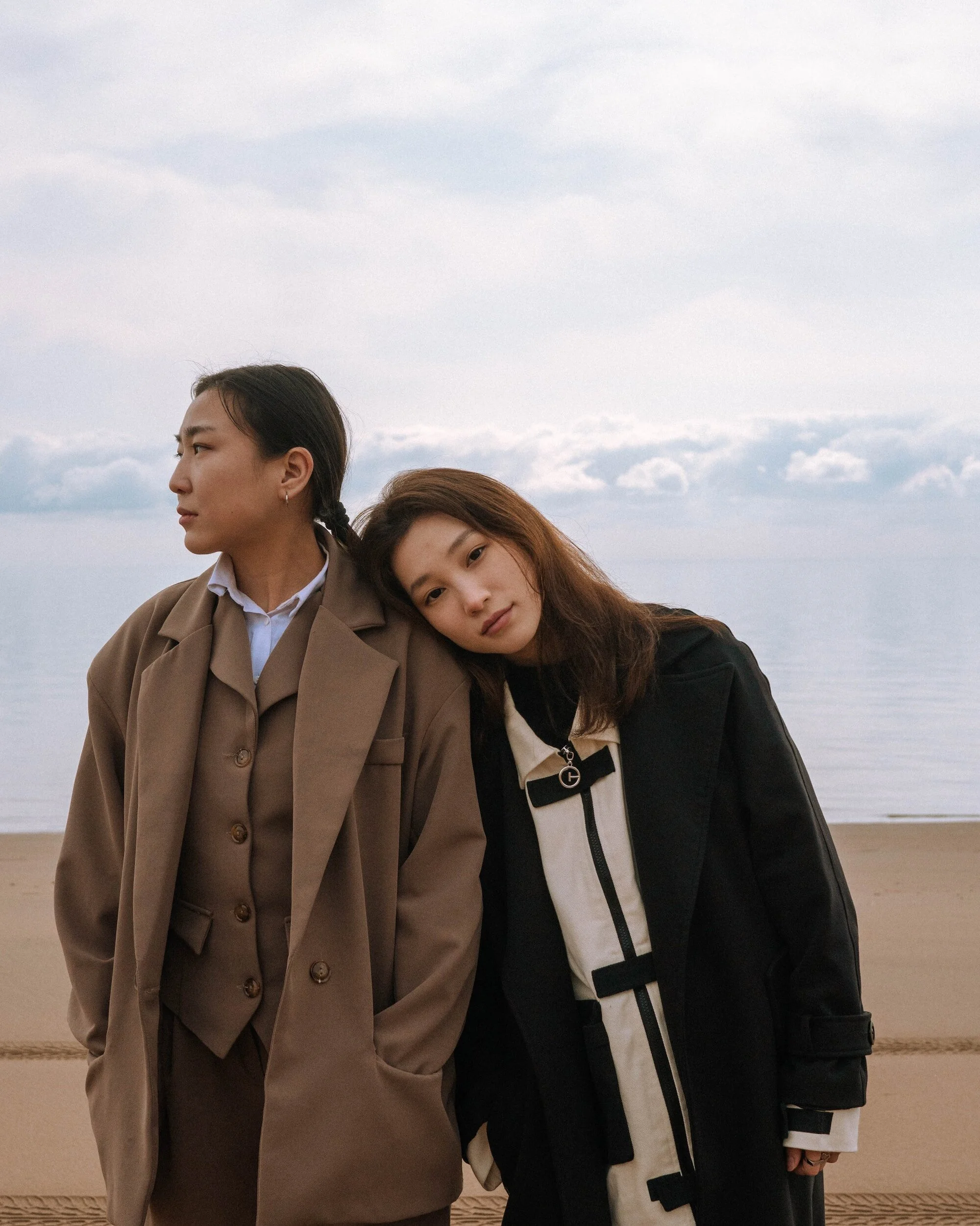 Two women, one resting her head on the other's shoulder, capturing a quiet moment of connection and intimacy.